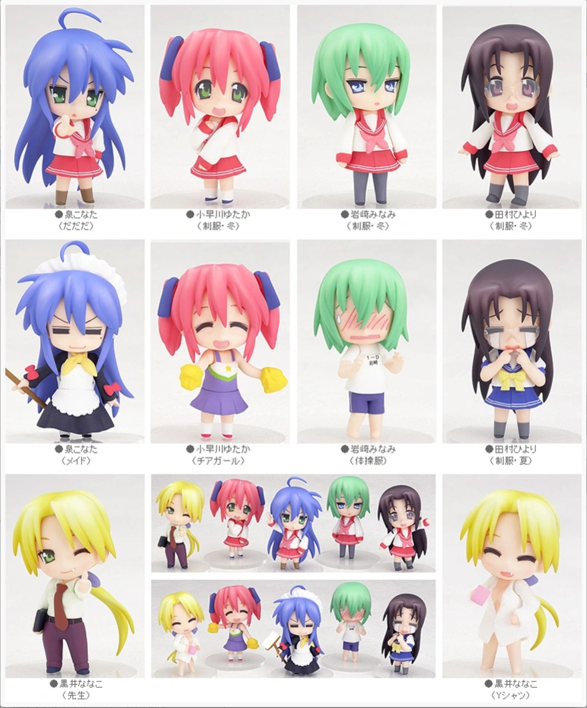 「TVアニメ らき☆すた」から、「らき☆すた」シーズン2がラインナップ!「泉こなた」以外はシーズン1から一新。「小早川ゆたか」「黒井ななこ」と言った脇を固めるキャラクター達が、制服体操服メイド衣装チアガールと様々なコスチュームでねんどろいどぷちに!