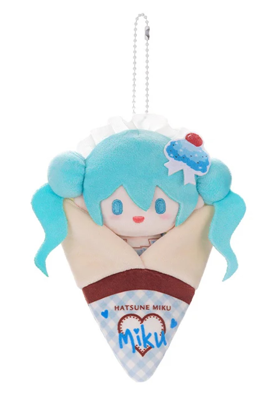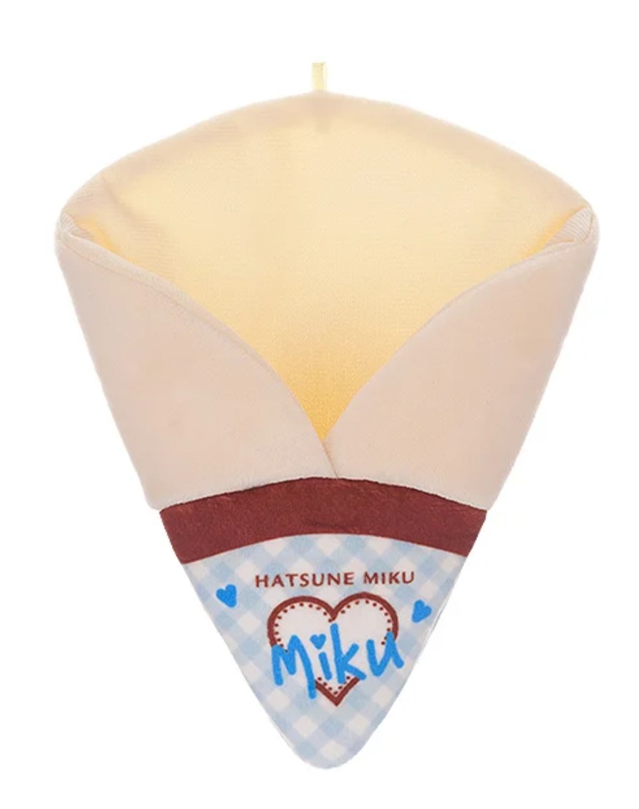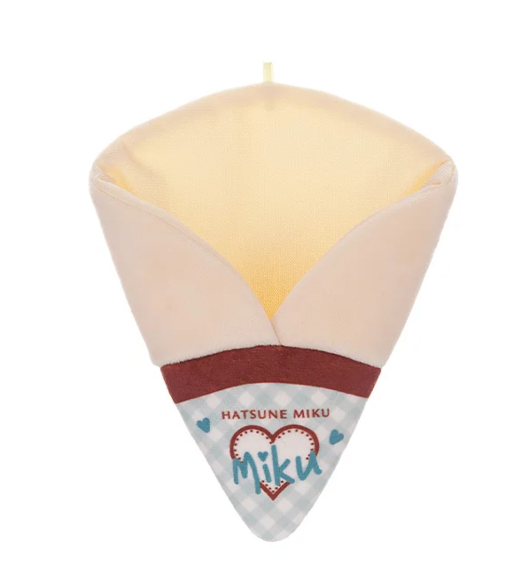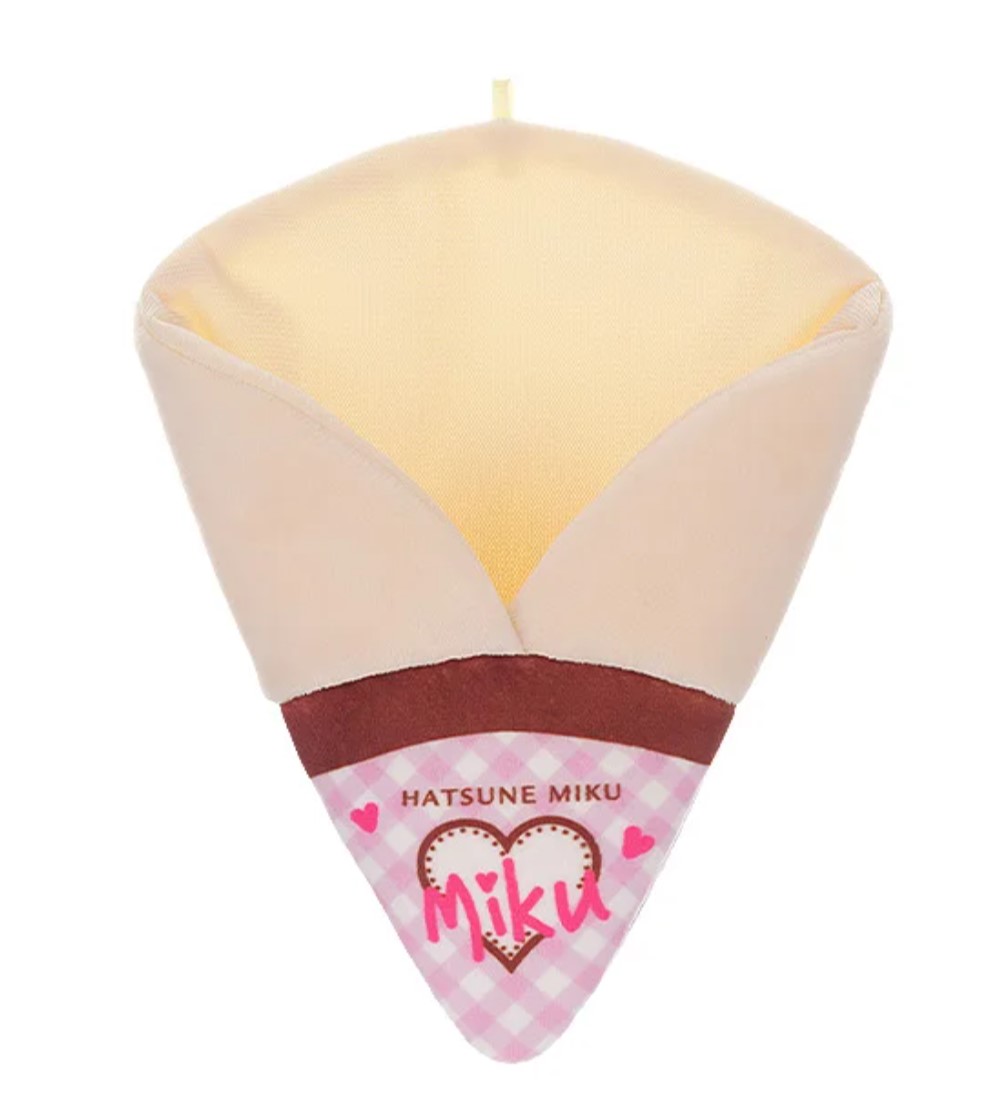 キャラクター・ボーカル・シリーズ01 初音ミク」から、「ふわふわのミクちゃんクレープ」がぬいぐるみ化!クレープ部分はゴムバンドでぬいぐるみと固定できる仕様で、着せ替え遊びも可能。