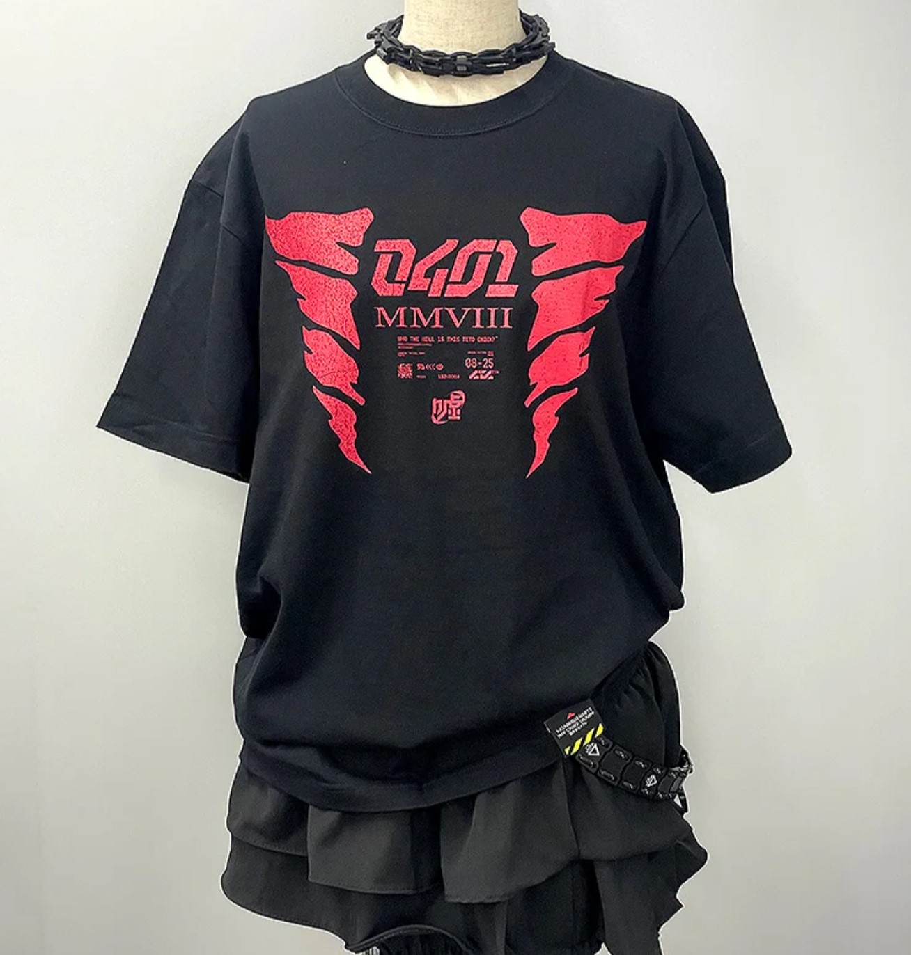 2つの赤いドリルをメインモチーフに、0401や(嘘)などのデザインで構成したグラフィックTシャツ。