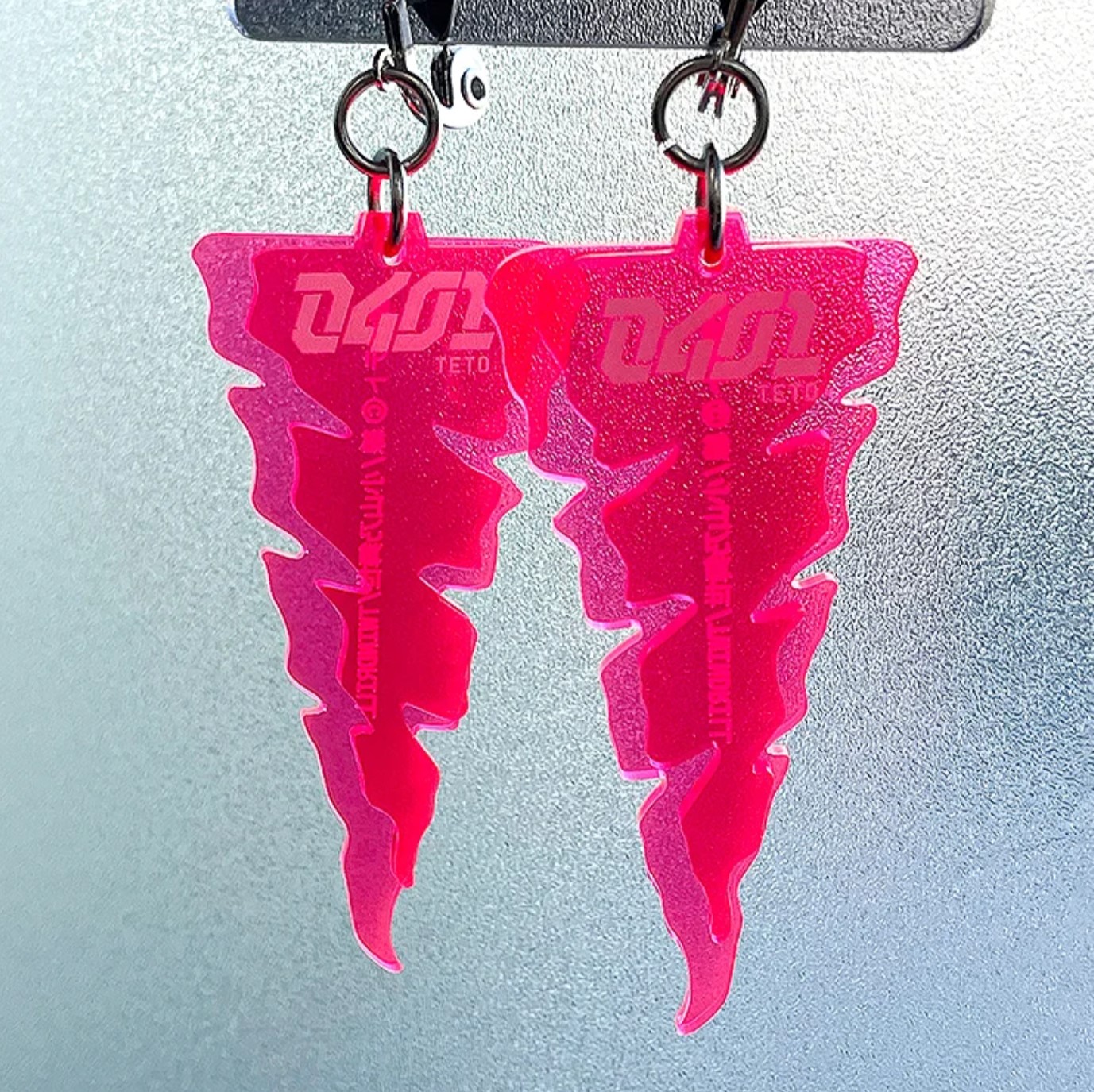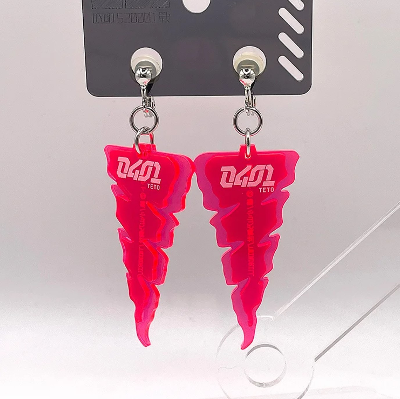 重音テトの髪型をモチーフに、蛍光素材の赤いアクリル板を重ねてデザインしたイヤリング/ピアス。0401TETOのグラフィックプリントいり。