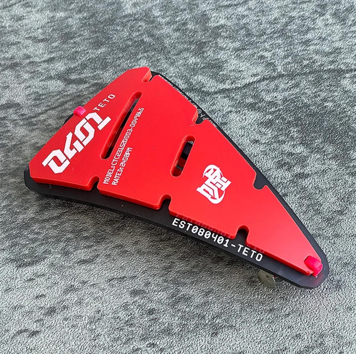 重音テトの0401や(嘘)などのグラフィックがプリントされた赤いドリルのバレッタ。