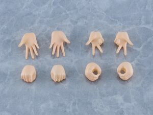 手首パーツは「握り手」「平手」「ピース手」「持ち手」の4種が付属。「持ち手」の穴は3mm径になっており、径が合うものを自由に持たせることができます。