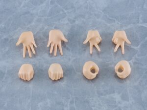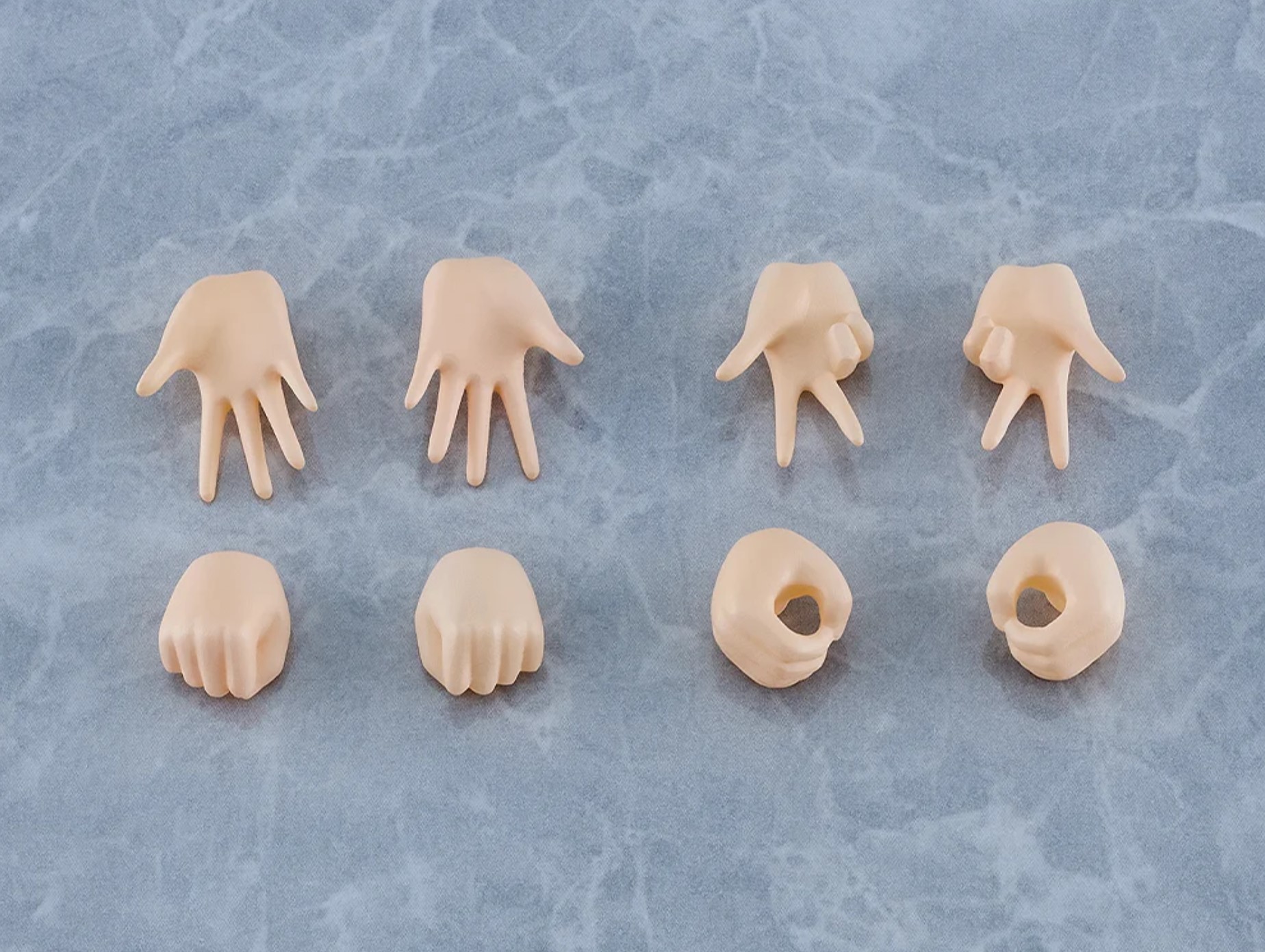 | 手首パーツは「握り手」「平手」「ピース手」「持ち手」の4種が付属。「持ち手」の穴は3mm径になっており、径が合うものを自由に持たせることができます。 |